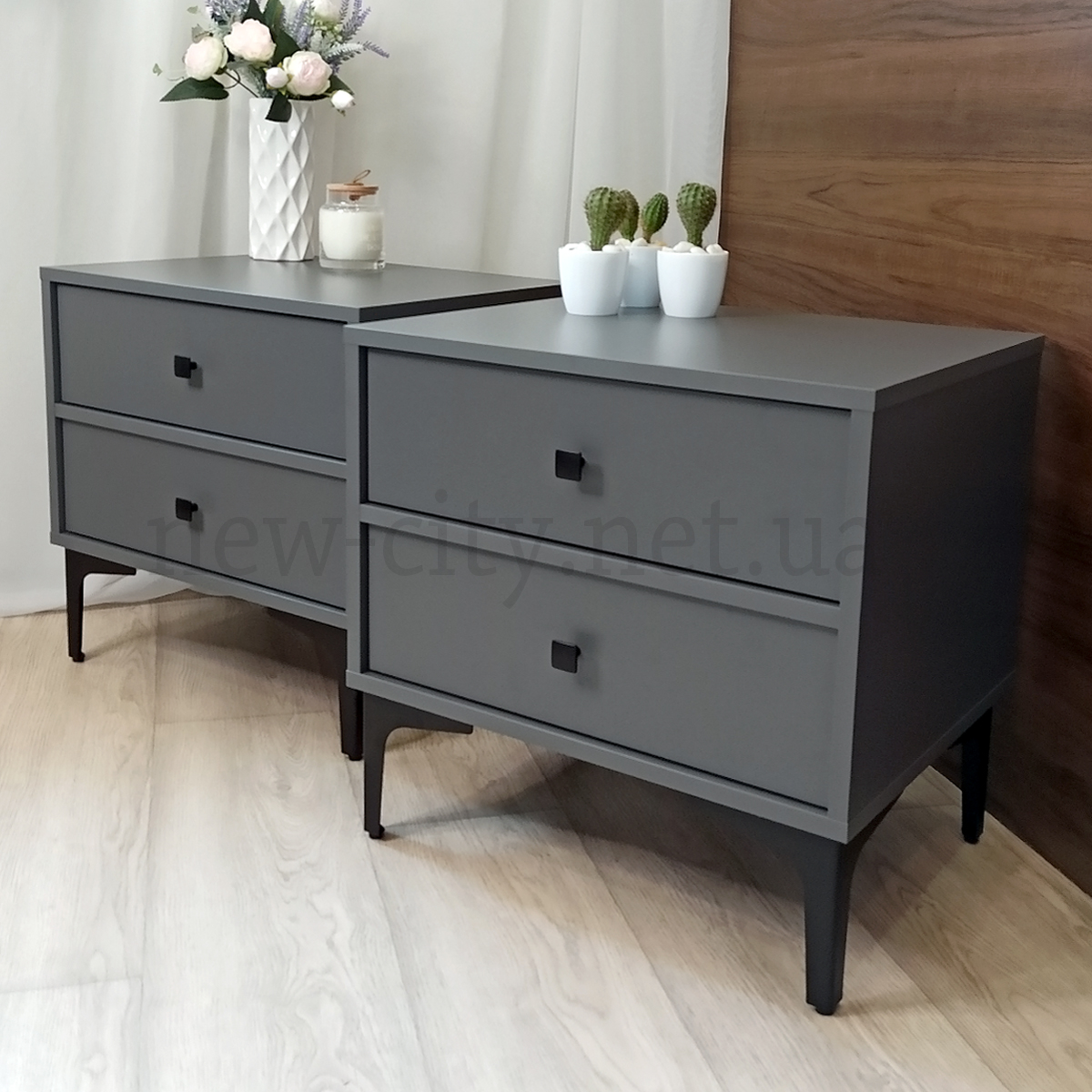 Оригинальные серые прикроватные тумбы с черными квадратными ручками, станут незаменимой частью вашей спальни. В них удобно могут разместится необходимые мелочи – телефон, зарядное, а может даже ваза с цветами или ночной светильник.